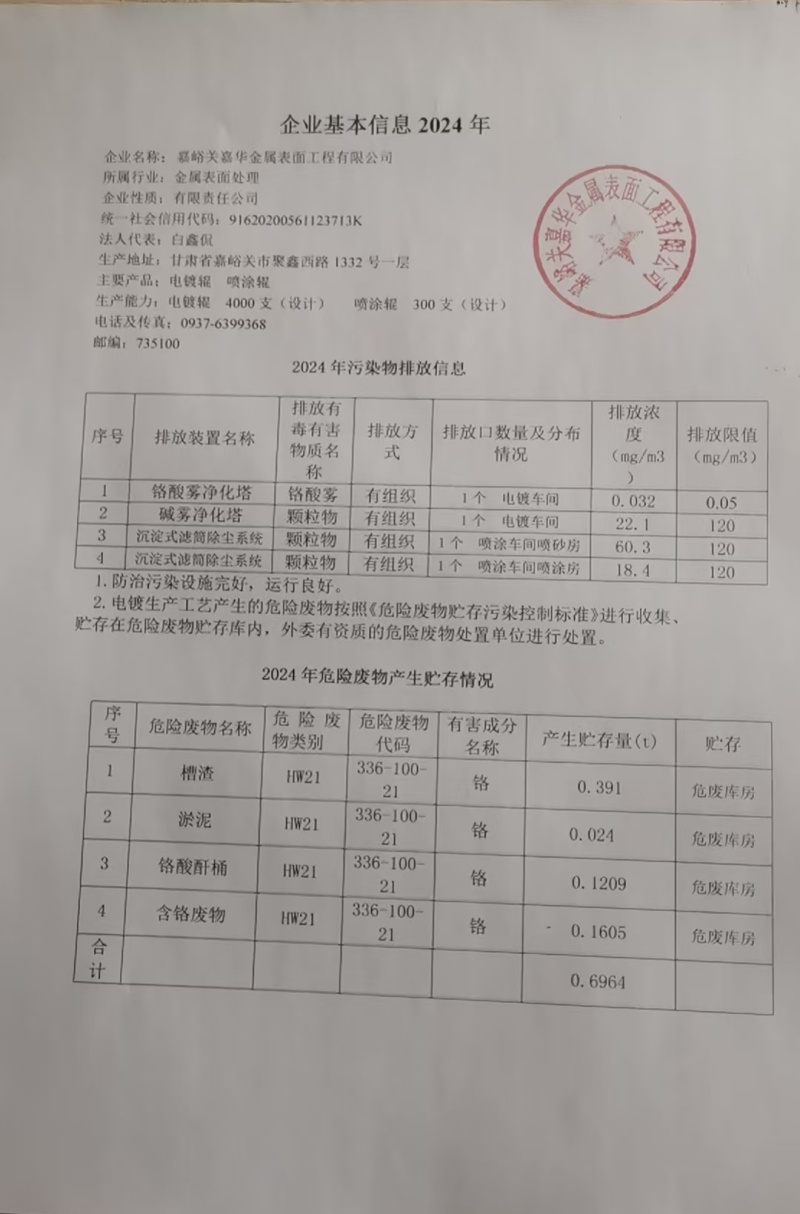 嘉峪關(guān)嘉華金屬表面工程有限公司2024環(huán)境信息公開情況
